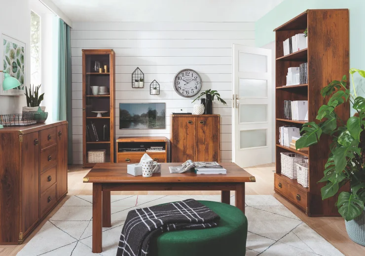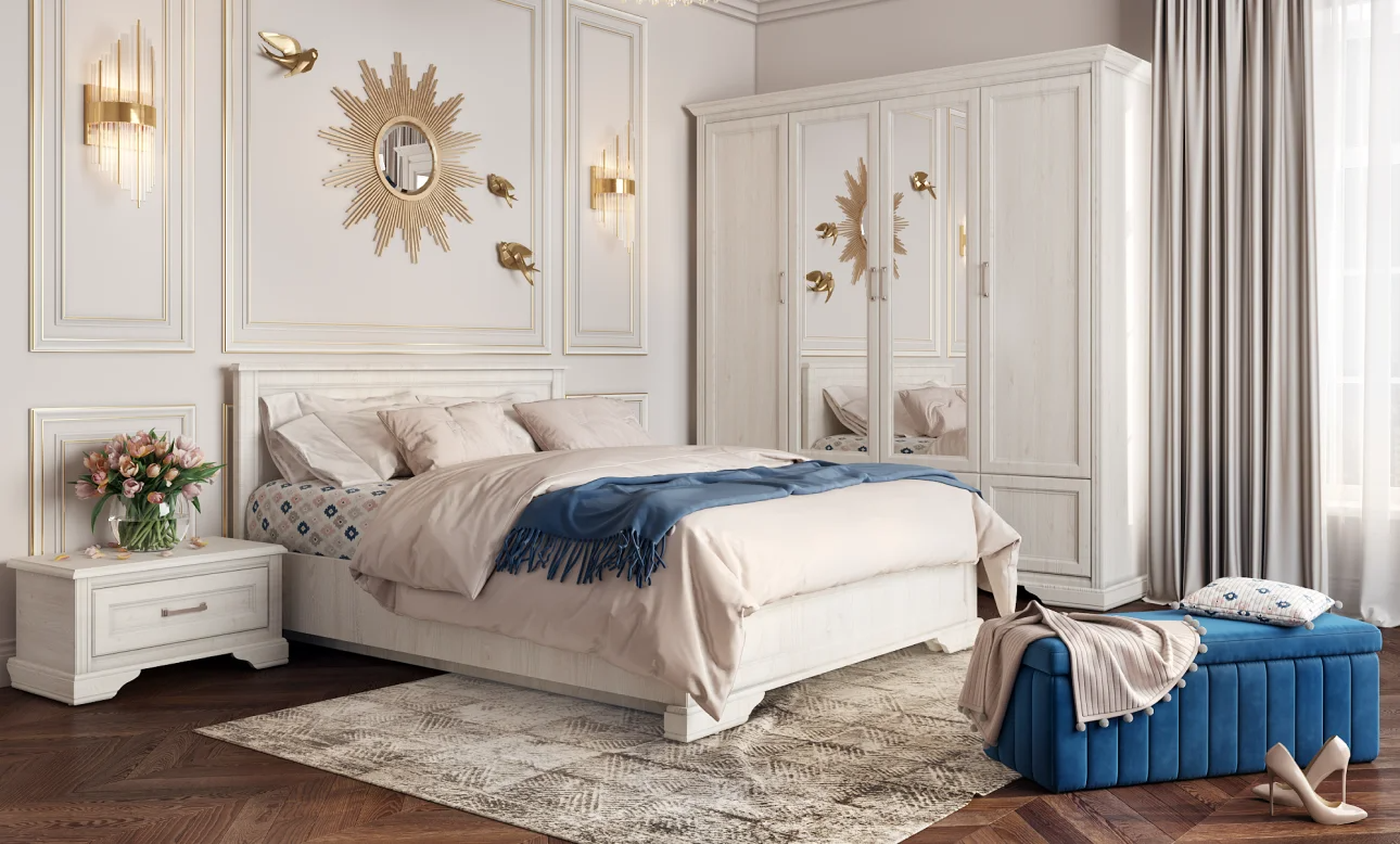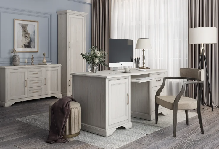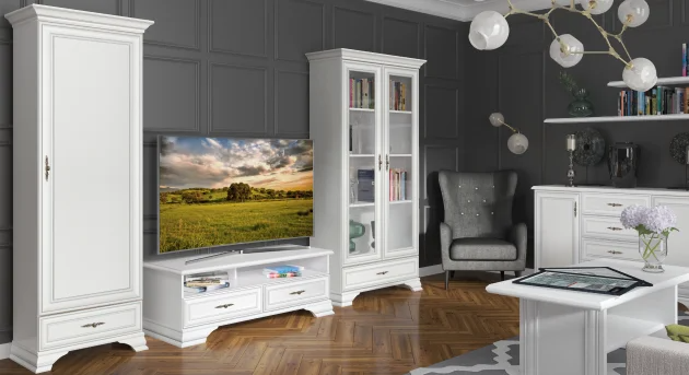 Кентаки - мебель классического стиля, отличающаяся природными цветами, отделкой фактурой, всегда актуально и востребована, она настолько универсальна, что без проблем впишется в любой современный дизайн. Стиль набора модульной мебели подчеркивается лакированной патинированной планкой в фасадах, карнизами - завершающим акцентом в зеркалах и высоких элементах набора, витиеватыми ручками.